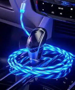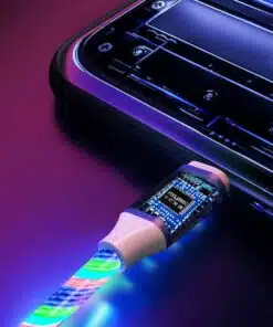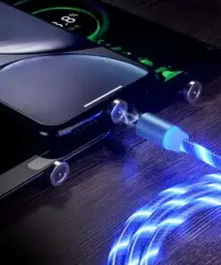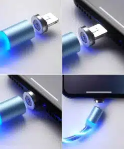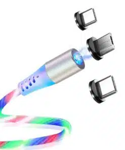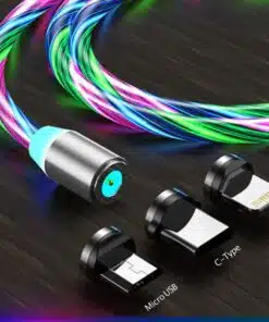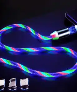 Slitstark magnetladdningskabel med 3 LED-färger - röd, blå och grön - som löper längs kabelns längd under laddningen